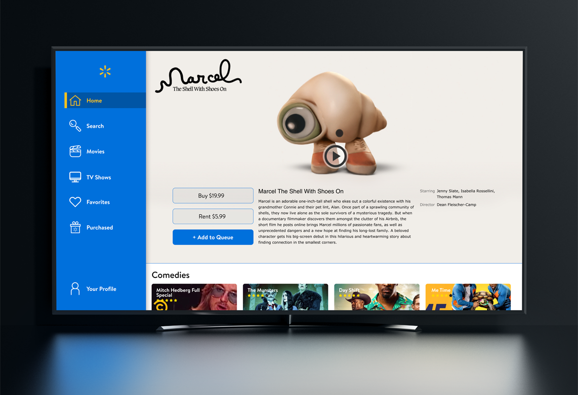 My key achievement was creating a tangible design concept that successfully visualized how Walmart could potentially blend streaming entertainment with its e-commerce strengths in a user-centric way, offering a distinct experience in the competitive streaming market.